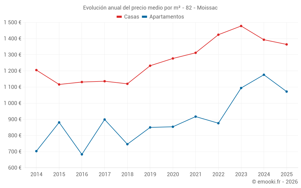 El precio mediano en las 26 transacciones de apartamentos de los últimos 12 meses en la comuna de Moissac fue de 1 014 € por metro cuadrado para un valor patrimonial medio de 117 500 €. Durante este período el 60% de las transacciones estuvieron entre 753 y 1 448 € por metro cuadrado (del 2º al 8º decil).
