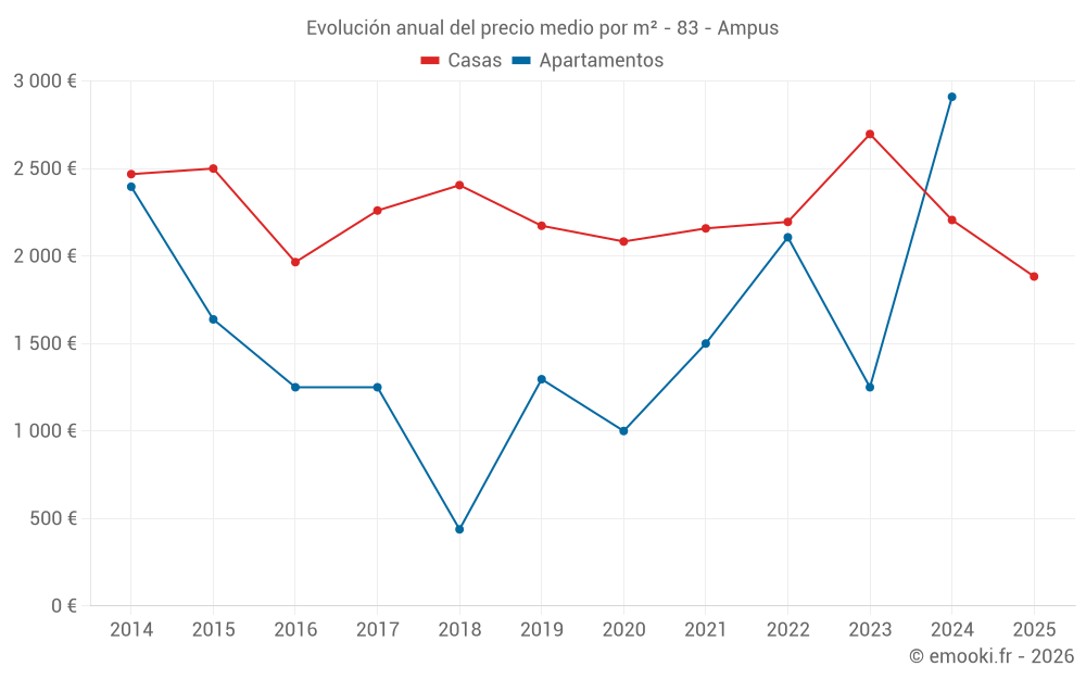 El precio mediano en las 33 transacciones de casas de los últimos 24 meses en la comuna de Ampus fue de 2 625 € por metro cuadrado para un valor patrimonial medio de 199 990 €. Durante este período el 60% de las transacciones estuvieron entre 1 051 y 3 070 € por metro cuadrado (del 2º al 8º decil).