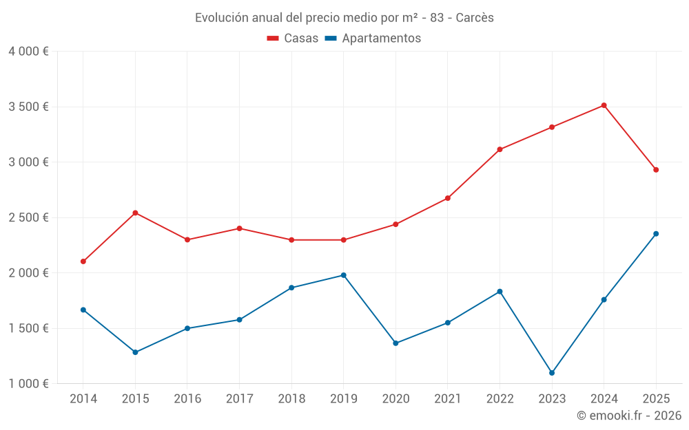 El precio mediano en las 26 transacciones de casas de los últimos 6 meses en la comuna de Carcès fue de 2 931 € por metro cuadrado para un valor patrimonial medio de 223 000 €. Durante este período el 60% de las transacciones estuvieron entre 2 214 y 3 981 € por metro cuadrado (del 2º al 8º decil).