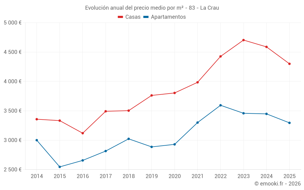 El precio mediano en las 23 transacciones de apartamentos de los últimos 6 meses en la comuna de La Crau fue de 3 295 € por metro cuadrado para un valor patrimonial medio de 201 000 €. Durante este período el 60% de las transacciones estuvieron entre 2 492 y 4 094 € por metro cuadrado (del 2º al 8º decil).