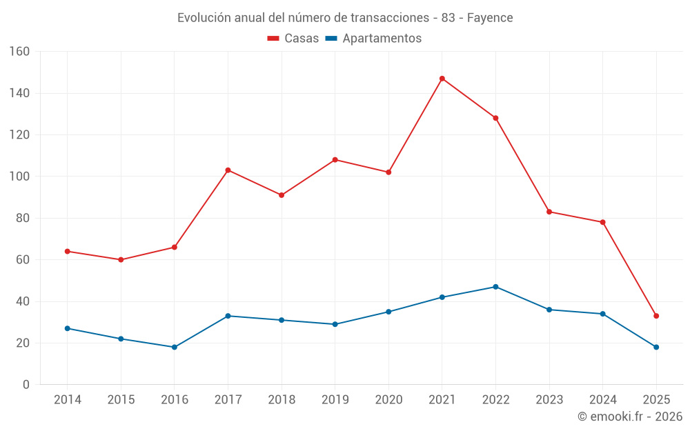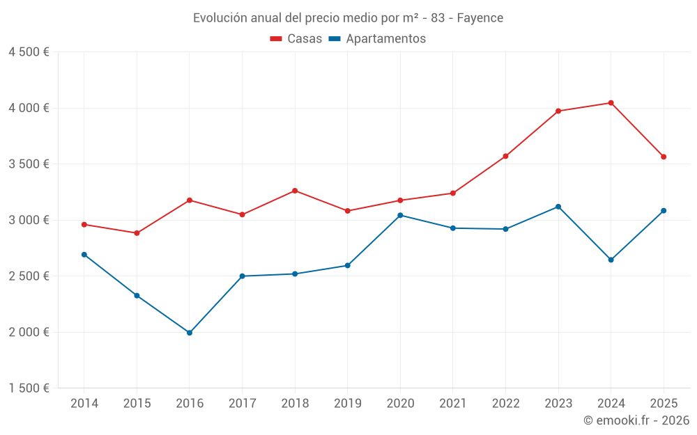 El precio mediano en las 18 transacciones de apartamentos de los últimos 6 meses en la comuna de Fayence fue de 3 084 € por metro cuadrado para un valor patrimonial medio de 152 500 €. Durante este período el 60% de las transacciones estuvieron entre 2 377 y 4 867 € por metro cuadrado (del 2º al 8º decil).