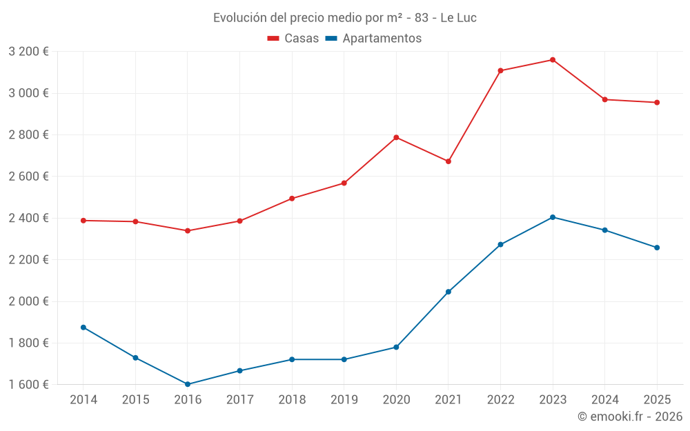El precio mediano en las 29 transacciones de apartamentos de los últimos 6 meses en la comuna de Le Luc fue de 2 258 € por metro cuadrado para un valor patrimonial medio de 139 990 €. Durante este período el 60% de las transacciones estuvieron entre 1 785 y 2 817 € por metro cuadrado (del 2º al 8º decil).