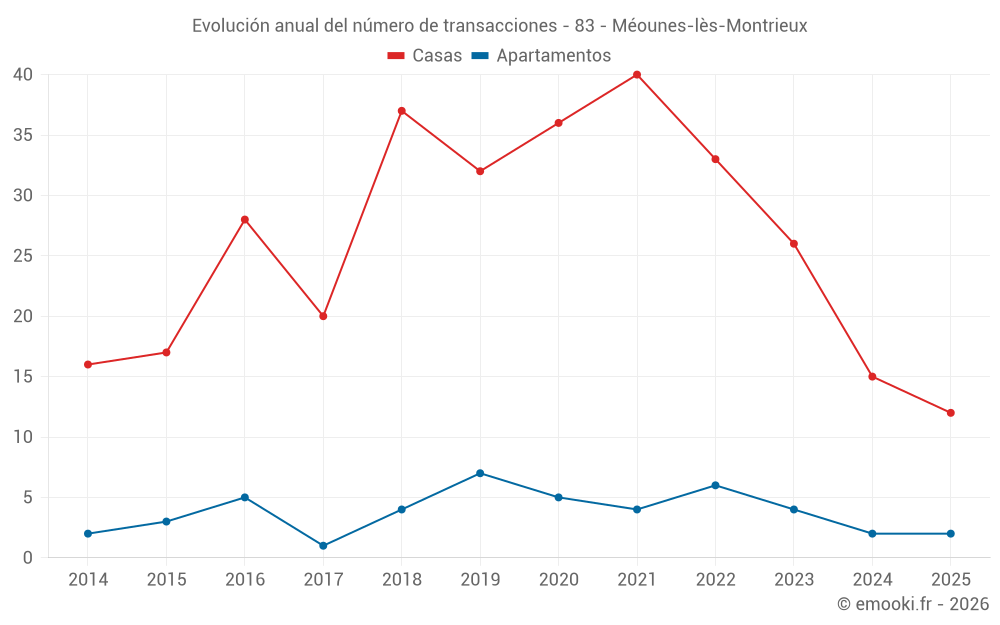 El precio mediano en las 25 transacciones de casas de los últimos 12 meses en la comuna de Méounes-lès-Montrieux fue de 3 350 € por metro cuadrado para un valor patrimonial medio de 328 000 €. Durante este período el 60% de las transacciones estuvieron entre 2 062 y 4 319 € por metro cuadrado (del 2º al 8º decil).