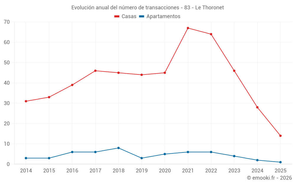 El precio mediano en las 29 transacciones de casas de los últimos 12 meses en la comuna de Le Thoronet fue de 3 067 € por metro cuadrado para un valor patrimonial medio de 320 000 €. Durante este período el 60% de las transacciones estuvieron entre 2 458 y 3 814 € por metro cuadrado (del 2º al 8º decil).