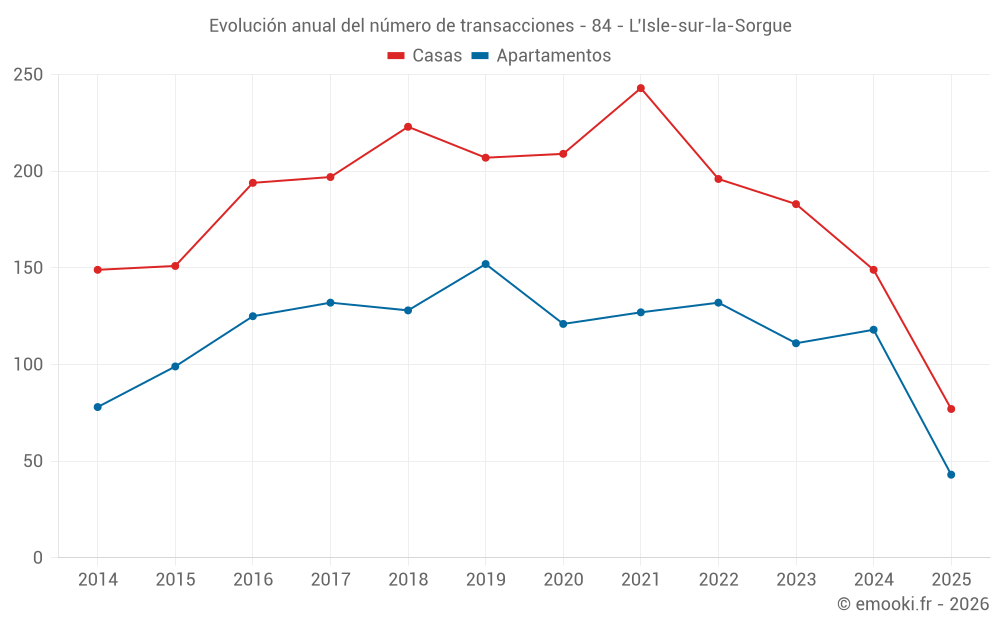 El precio mediano en las 30 transacciones de casas de los últimos 3 meses en la comuna de L'Isle-sur-la-Sorgue fue de 3 548 € por metro cuadrado para un valor patrimonial medio de 305 000 €. Durante este período el 60% de las transacciones estuvieron entre 2 663 y 4 848 € por metro cuadrado (del 2º al 8º decil).