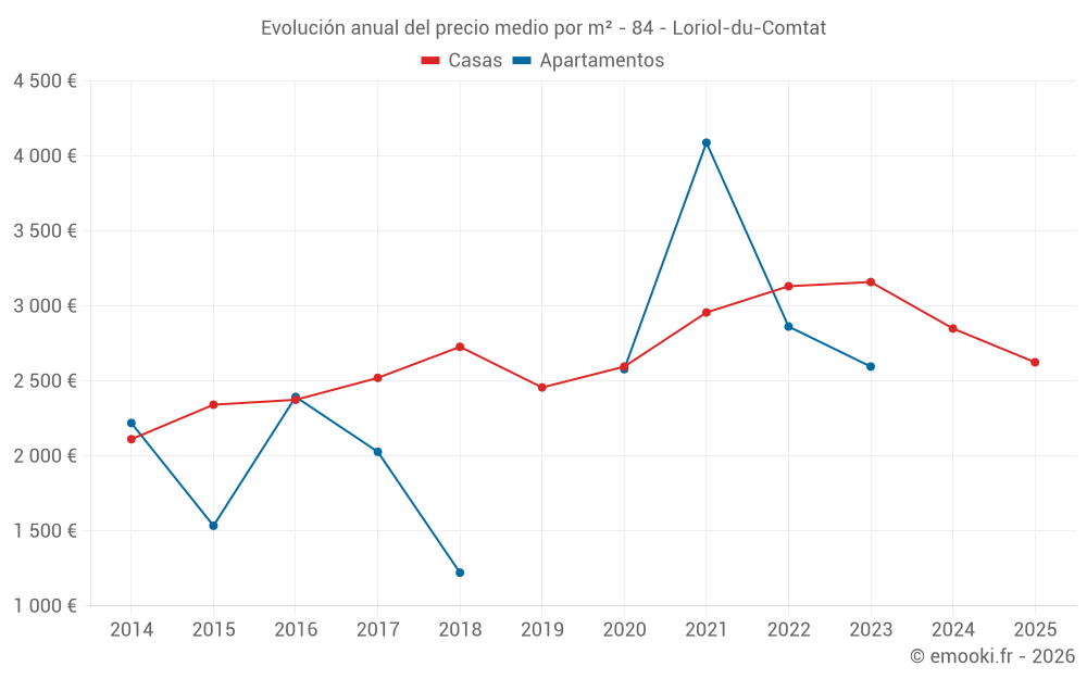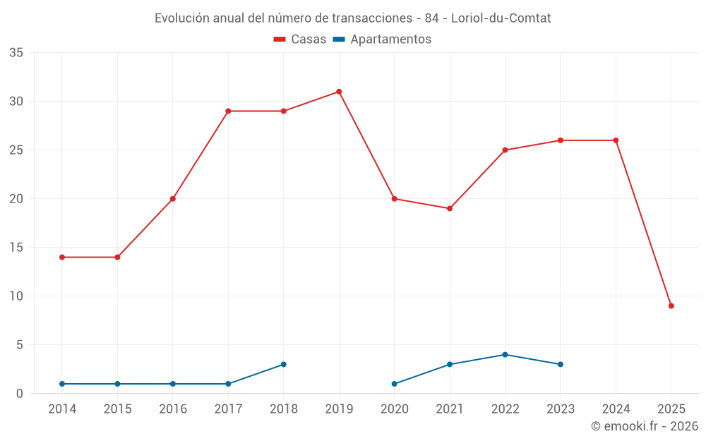 El precio mediano en las 23 transacciones de casas de los últimos 12 meses en la comuna de Loriol-du-Comtat fue de 2 632 € por metro cuadrado para un valor patrimonial medio de 293 500 €. Durante este período el 60% de las transacciones estuvieron entre 1 861 y 3 328 € por metro cuadrado (del 2º al 8º decil).