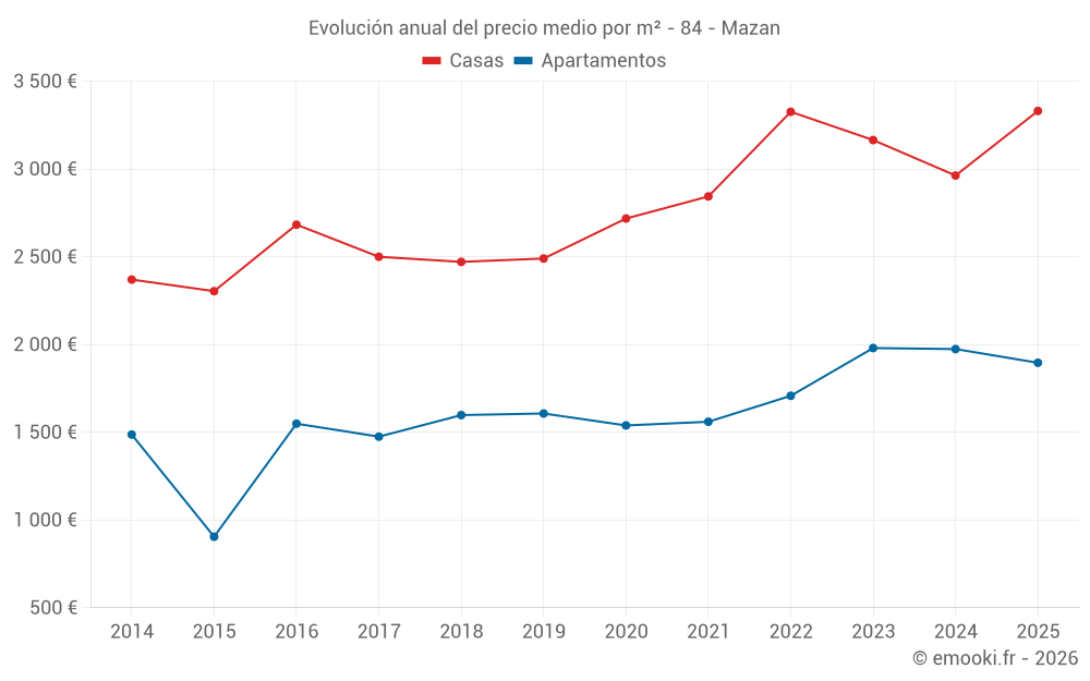El precio mediano en las 24 transacciones de casas de los últimos 6 meses en la comuna de Mazan fue de 3 331 € por metro cuadrado para un valor patrimonial medio de 299 050 €. Durante este período el 60% de las transacciones estuvieron entre 1 891 y 3 981 € por metro cuadrado (del 2º al 8º decil).