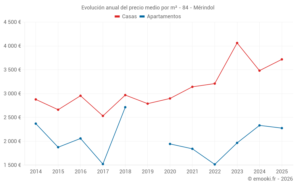 El precio mediano en las 18 transacciones de casas de los últimos 12 meses en la comuna de Mérindol fue de 3 718 € por metro cuadrado para un valor patrimonial medio de 329 800 €. Durante este período el 60% de las transacciones estuvieron entre 2 902 y 5 769 € por metro cuadrado (del 2º al 8º decil).