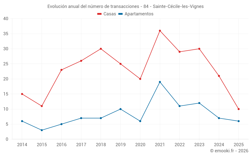 El precio mediano en las 17 transacciones de apartamentos de los últimos 24 meses en la comuna de Sainte-Cécile-les-Vignes fue de 2 633 € por metro cuadrado para un valor patrimonial medio de 119 000 €. Durante este período el 60% de las transacciones estuvieron entre 2 035 y 2 851 € por metro cuadrado (del 2º al 8º decil).