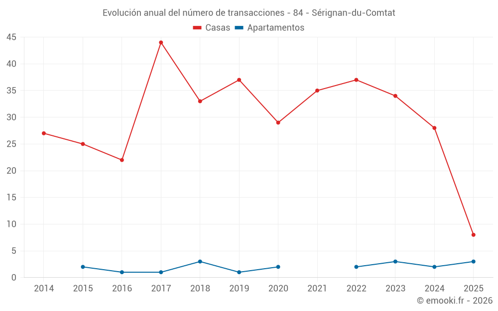 El precio mediano en las 27 transacciones de casas de los últimos 12 meses en la comuna de Sérignan-du-Comtat fue de 2 598 € por metro cuadrado para un valor patrimonial medio de 230 000 €. Durante este período el 60% de las transacciones estuvieron entre 1 693 y 3 323 € por metro cuadrado (del 2º al 8º decil).