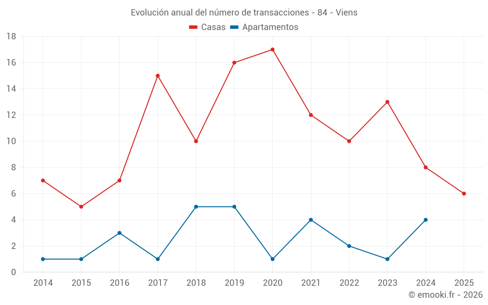 El precio mediano en las 20 transacciones de casas de los últimos 24 meses en la comuna de Viens fue de 2 556 € por metro cuadrado para un valor patrimonial medio de 247 500 €. Durante este período el 60% de las transacciones estuvieron entre 1 963 y 3 520 € por metro cuadrado (del 2º al 8º decil).