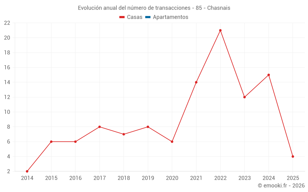 El precio mediano en las 24 transacciones de casas de los últimos 24 meses en la comuna de Chasnais fue de 1 936 € por metro cuadrado para un valor patrimonial medio de 194 750 €. Durante este período el 60% de las transacciones estuvieron entre 1 375 y 2 297 € por metro cuadrado (del 2º al 8º decil).
