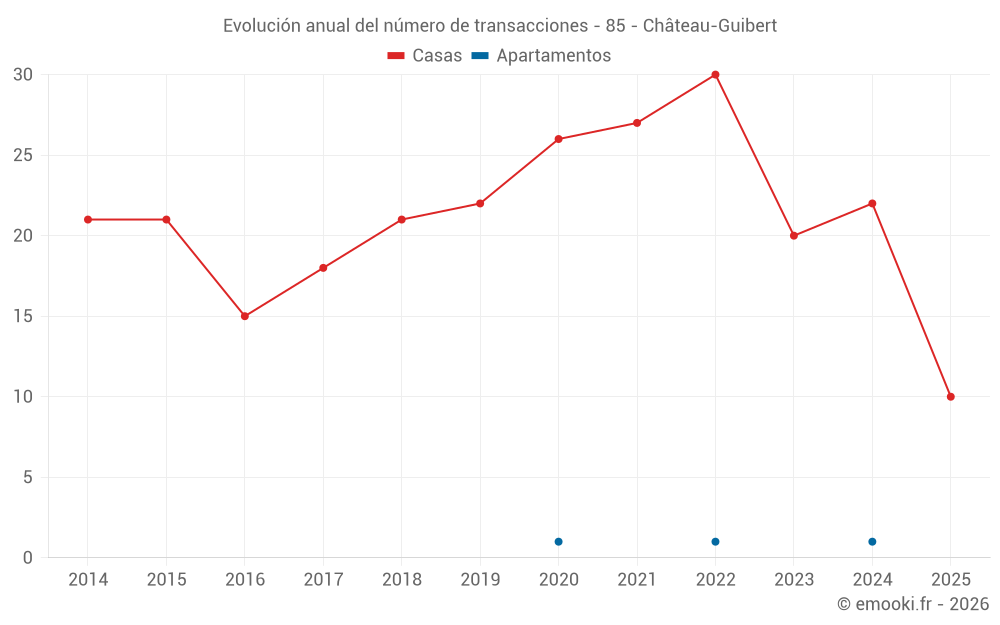 El precio mediano en las 19 transacciones de casas de los últimos 12 meses en la comuna de Château-Guibert fue de 1 676 € por metro cuadrado para un valor patrimonial medio de 133 500 €. Durante este período el 60% de las transacciones estuvieron entre 927 y 2 091 € por metro cuadrado (del 2º al 8º decil).