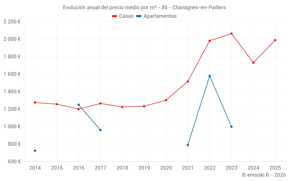 El precio mediano en las 22 transacciones de casas de los últimos 6 meses en la comuna de Chavagnes-en-Paillers fue de 1 988 € por metro cuadrado para un valor patrimonial medio de 168 500 €. Durante este período el 60% de las transacciones estuvieron entre 1 473 y 2 416 € por metro cuadrado (del 2º al 8º decil).