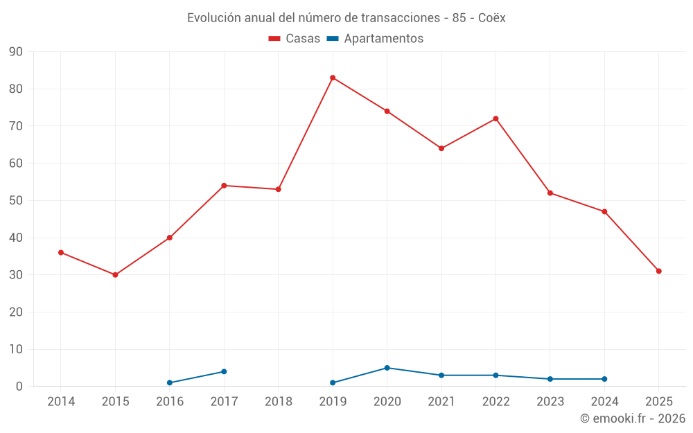 El precio mediano en las 31 transacciones de casas de los últimos 6 meses en la comuna de Coëx fue de 2 447 € por metro cuadrado para un valor patrimonial medio de 230 000 €. Durante este período el 60% de las transacciones estuvieron entre 1 809 y 2 857 € por metro cuadrado (del 2º al 8º decil).