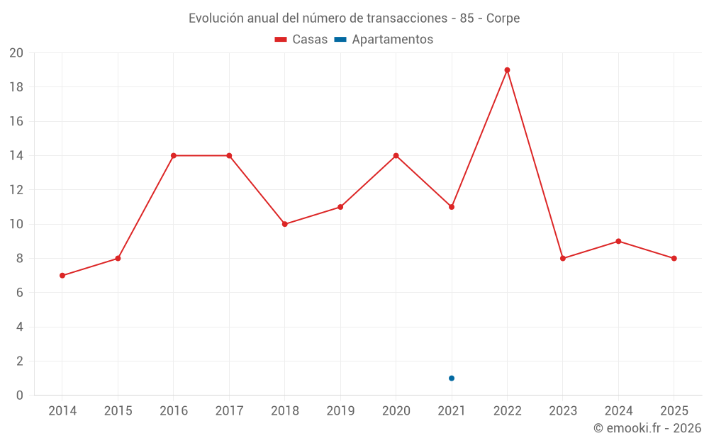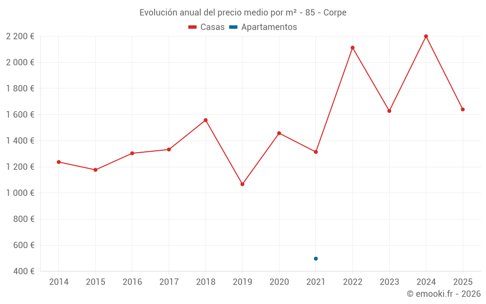 El precio mediano en las 20 transacciones de casas de los últimos 24 meses en la comuna de Corpe fue de 2 046 € por metro cuadrado para un valor patrimonial medio de 195 050 €. Durante este período el 60% de las transacciones estuvieron entre 1 530 y 2 534 € por metro cuadrado (del 2º al 8º decil).
