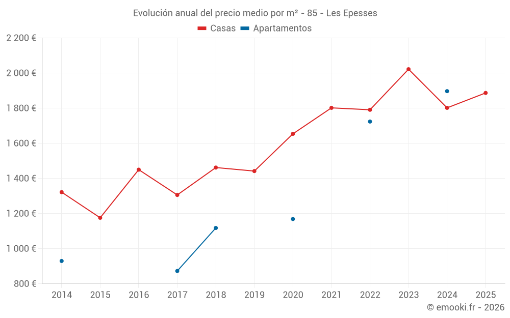 El precio mediano en las 29 transacciones de casas de los últimos 12 meses en la comuna de Les Epesses fue de 1 887 € por metro cuadrado para un valor patrimonial medio de 165 000 €. Durante este período el 60% de las transacciones estuvieron entre 1 355 y 2 323 € por metro cuadrado (del 2º al 8º decil).