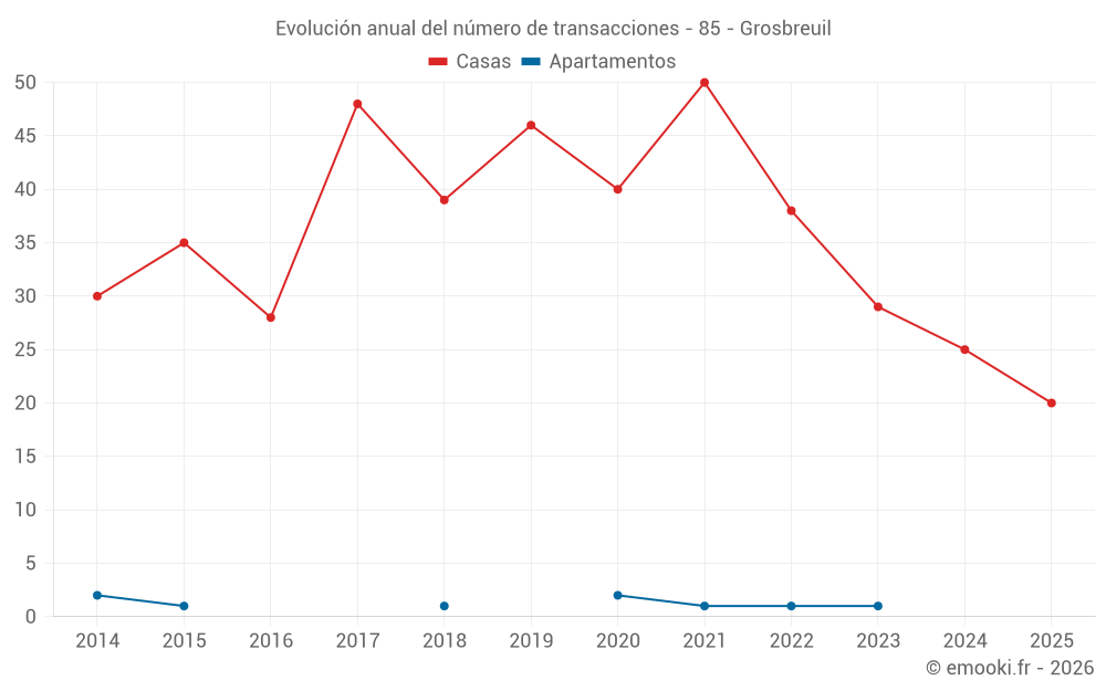 El precio mediano en las 20 transacciones de casas de los últimos 6 meses en la comuna de Grosbreuil fue de 2 490 € por metro cuadrado para un valor patrimonial medio de 247 500 €. Durante este período el 60% de las transacciones estuvieron entre 2 084 y 2 992 € por metro cuadrado (del 2º al 8º decil).