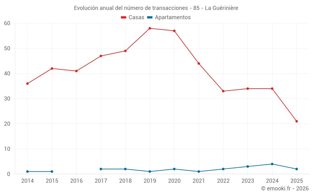 El precio mediano en las 21 transacciones de casas de los últimos 6 meses en la comuna de La Guérinière fue de 4 081 € por metro cuadrado para un valor patrimonial medio de 305 360 €. Durante este período el 60% de las transacciones estuvieron entre 2 595 y 5 094 € por metro cuadrado (del 2º al 8º decil).