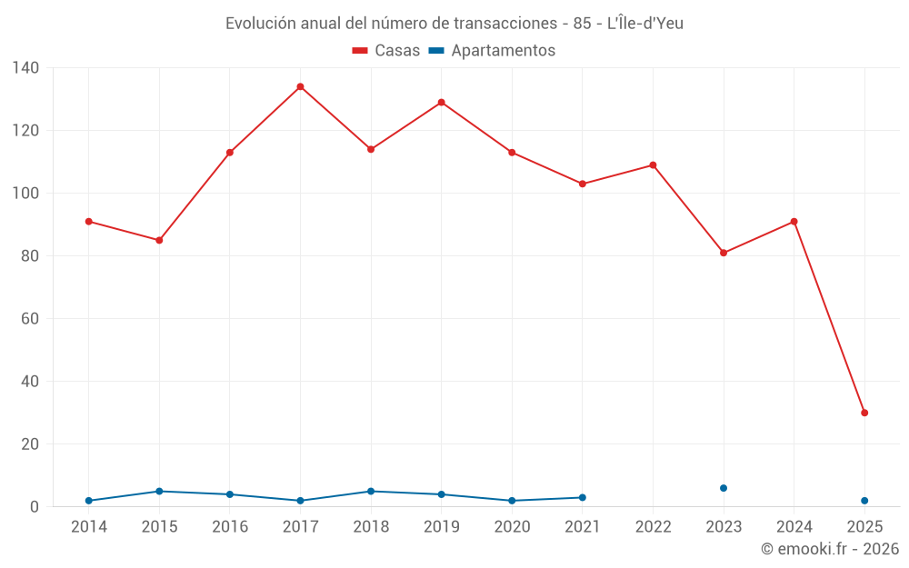 El precio mediano en las 30 transacciones de casas de los últimos 6 meses en la comuna de L'Île-d'Yeu fue de 5 492 € por metro cuadrado para un valor patrimonial medio de 480 000 €. Durante este período el 60% de las transacciones estuvieron entre 4 119 y 7 539 € por metro cuadrado (del 2º al 8º decil).
