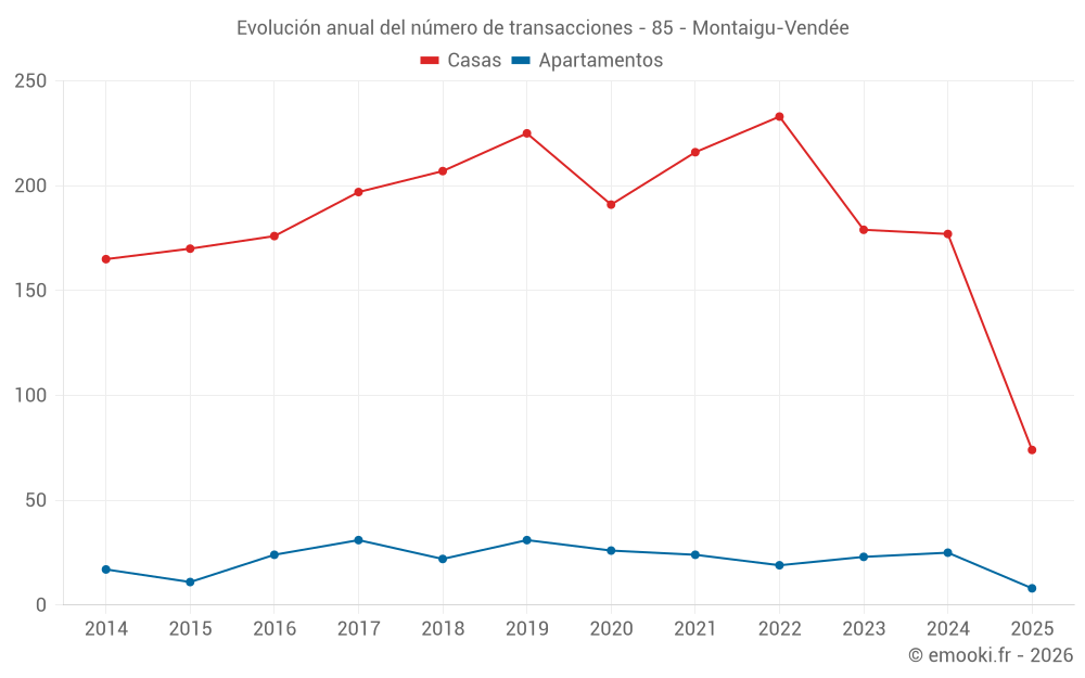 El precio mediano en las 22 transacciones de apartamentos de los últimos 12 meses en la comuna de Montaigu-Vendée fue de 2 377 € por metro cuadrado para un valor patrimonial medio de 119 500 €. Durante este período el 60% de las transacciones estuvieron entre 2 102 y 2 995 € por metro cuadrado (del 2º al 8º decil).