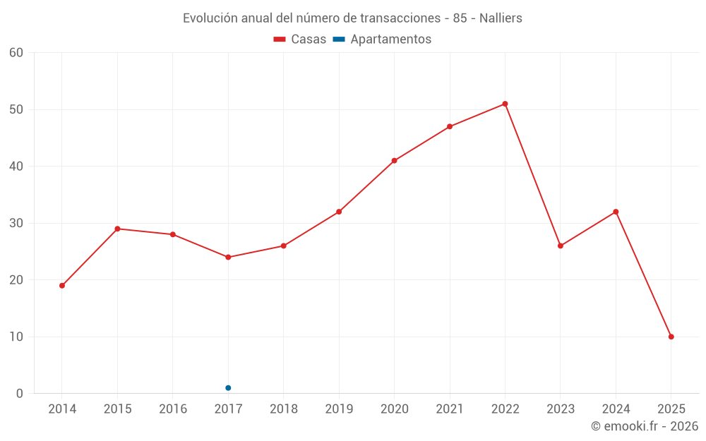 El precio mediano en las 29 transacciones de casas de los últimos 12 meses en la comuna de Nalliers fue de 1 389 € por metro cuadrado para un valor patrimonial medio de 150 000 €. Durante este período el 60% de las transacciones estuvieron entre 724 y 2 114 € por metro cuadrado (del 2º al 8º decil).