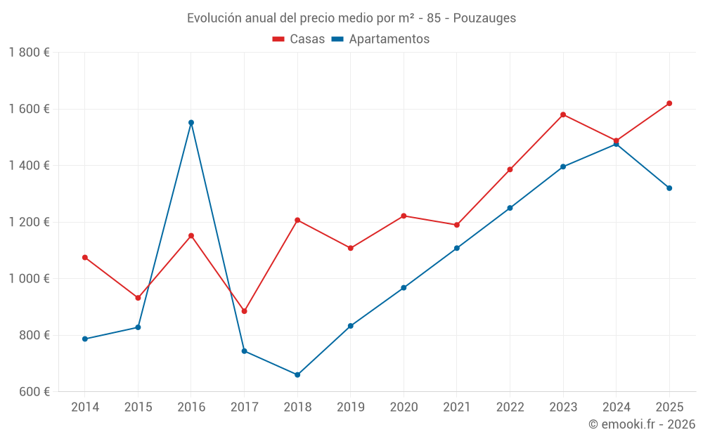 El precio mediano en las 19 transacciones de casas de los últimos 6 meses en la comuna de Pouzauges fue de 1 620 € por metro cuadrado para un valor patrimonial medio de 156 000 €. Durante este período el 60% de las transacciones estuvieron entre 1 202 y 1 954 € por metro cuadrado (del 2º al 8º decil).
