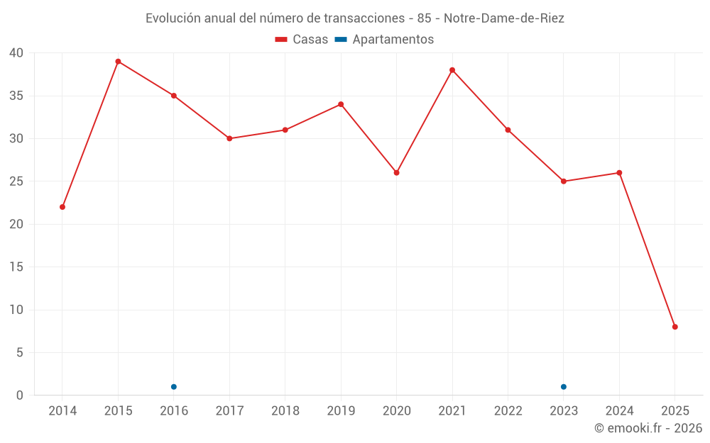 El precio mediano en las 22 transacciones de casas de los últimos 12 meses en la comuna de Notre-Dame-de-Riez fue de 2 657 € por metro cuadrado para un valor patrimonial medio de 216 920 €. Durante este período el 60% de las transacciones estuvieron entre 2 029 y 3 030 € por metro cuadrado (del 2º al 8º decil).