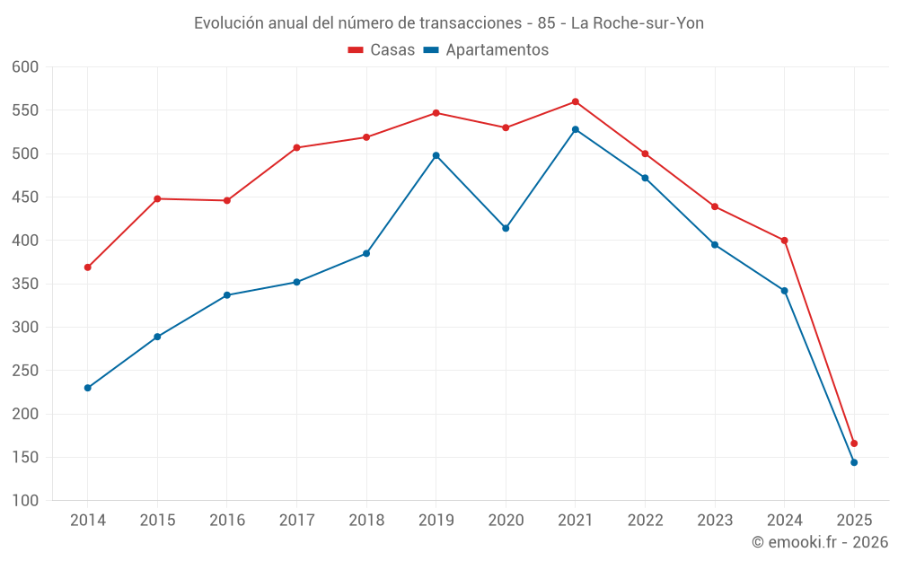 El precio mediano en las 77 transacciones de apartamentos de los últimos 3 meses en la comuna de La Roche-sur-Yon fue de 2 396 € por metro cuadrado para un valor patrimonial medio de 120 000 €. Durante este período el 60% de las transacciones estuvieron entre 1 883 y 3 044 € por metro cuadrado (del 2º al 8º decil).