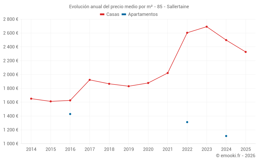El precio mediano en las 43 transacciones de casas de los últimos 12 meses en la comuna de Sallertaine fue de 2 419 € por metro cuadrado para un valor patrimonial medio de 247 500 €. Durante este período el 60% de las transacciones estuvieron entre 1 790 y 2 939 € por metro cuadrado (del 2º al 8º decil).