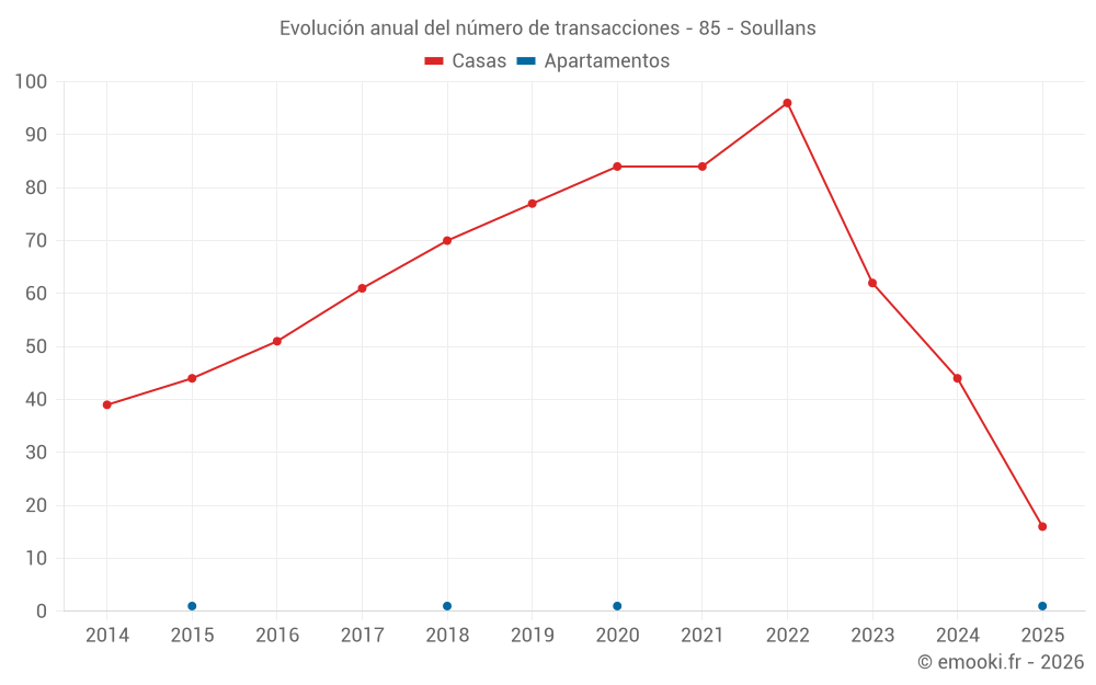 El precio mediano en las 39 transacciones de casas de los últimos 12 meses en la comuna de Soullans fue de 2 554 € por metro cuadrado para un valor patrimonial medio de 236 000 €. Durante este período el 60% de las transacciones estuvieron entre 1 495 y 2 879 € por metro cuadrado (del 2º al 8º decil).