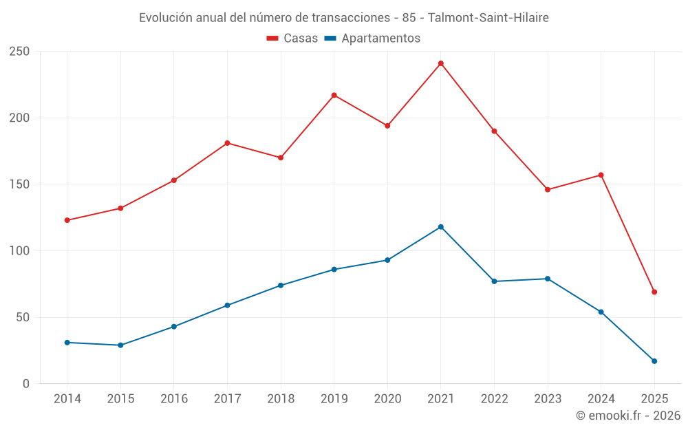 El precio mediano en las 45 transacciones de apartamentos de los últimos 12 meses en la comuna de Talmont-Saint-Hilaire fue de 3 432 € por metro cuadrado para un valor patrimonial medio de 109 300 €. Durante este período el 60% de las transacciones estuvieron entre 3 088 y 4 014 € por metro cuadrado (del 2º al 8º decil).