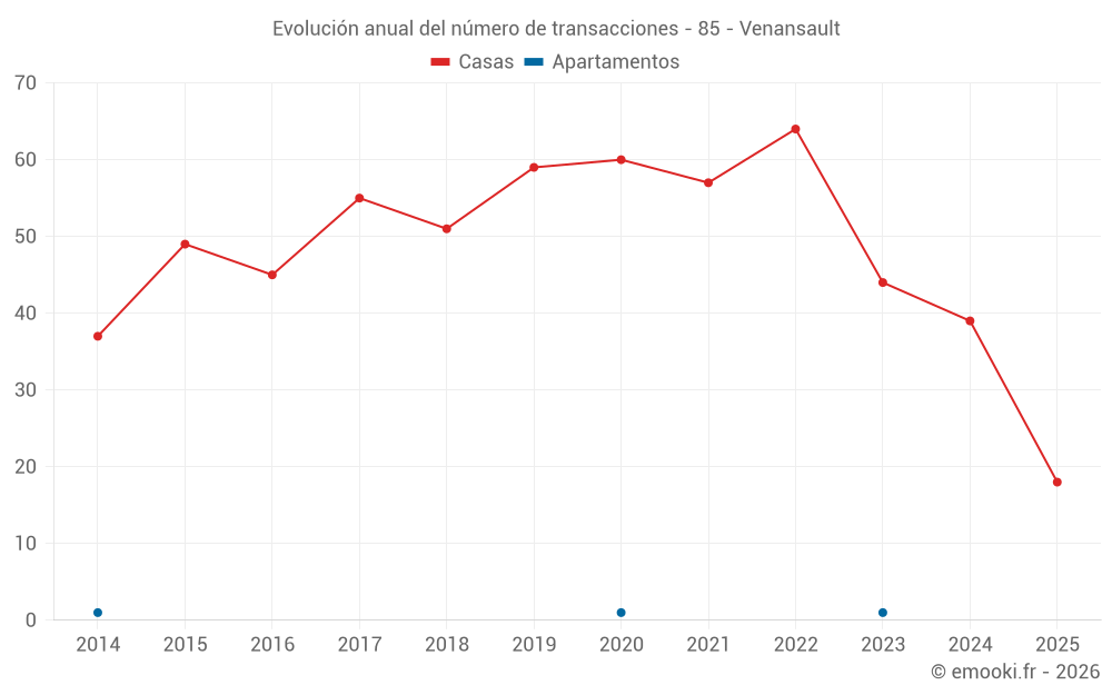 El precio mediano en las 18 transacciones de casas de los últimos 6 meses en la comuna de Venansault fue de 2 322 € por metro cuadrado para un valor patrimonial medio de 244 750 €. Durante este período el 60% de las transacciones estuvieron entre 1 758 y 2 734 € por metro cuadrado (del 2º al 8º decil).