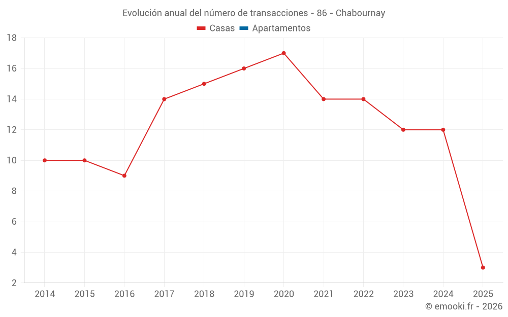 El precio mediano en las 22 transacciones de casas de los últimos 24 meses en la comuna de Chabournay fue de 1 584 € por metro cuadrado para un valor patrimonial medio de 162 500 €. Durante este período el 60% de las transacciones estuvieron entre 1 298 y 2 248 € por metro cuadrado (del 2º al 8º decil).