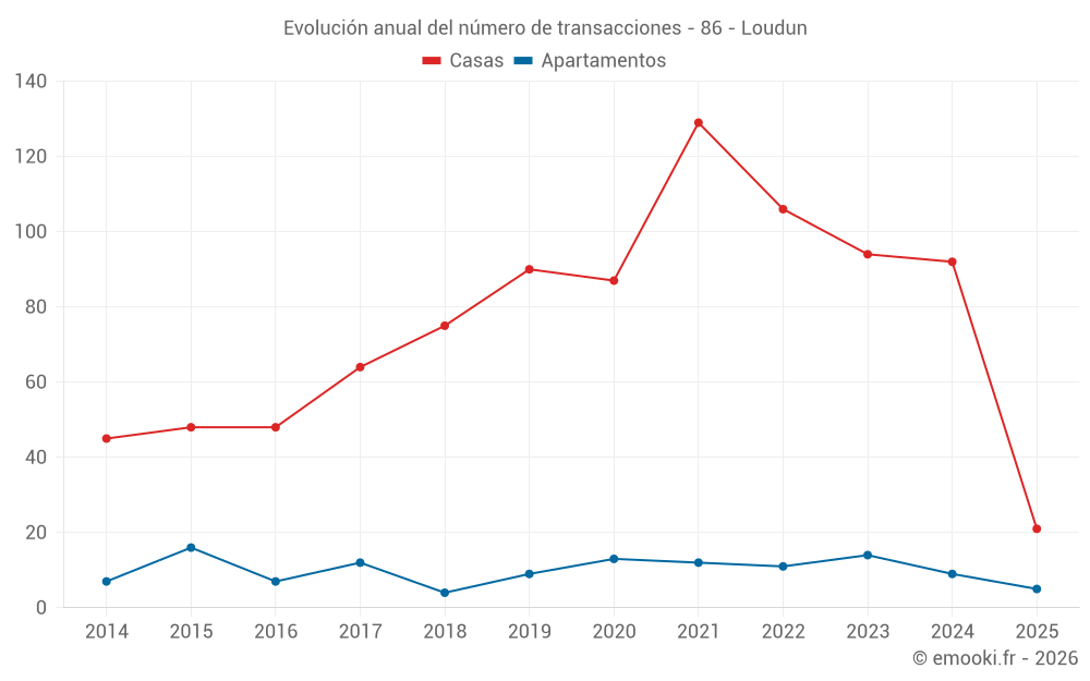 El precio mediano en las 21 transacciones de casas de los últimos 6 meses en la comuna de Loudun fue de 1 320 € por metro cuadrado para un valor patrimonial medio de 113 400 €. Durante este período el 60% de las transacciones estuvieron entre 940 y 1 765 € por metro cuadrado (del 2º al 8º decil).