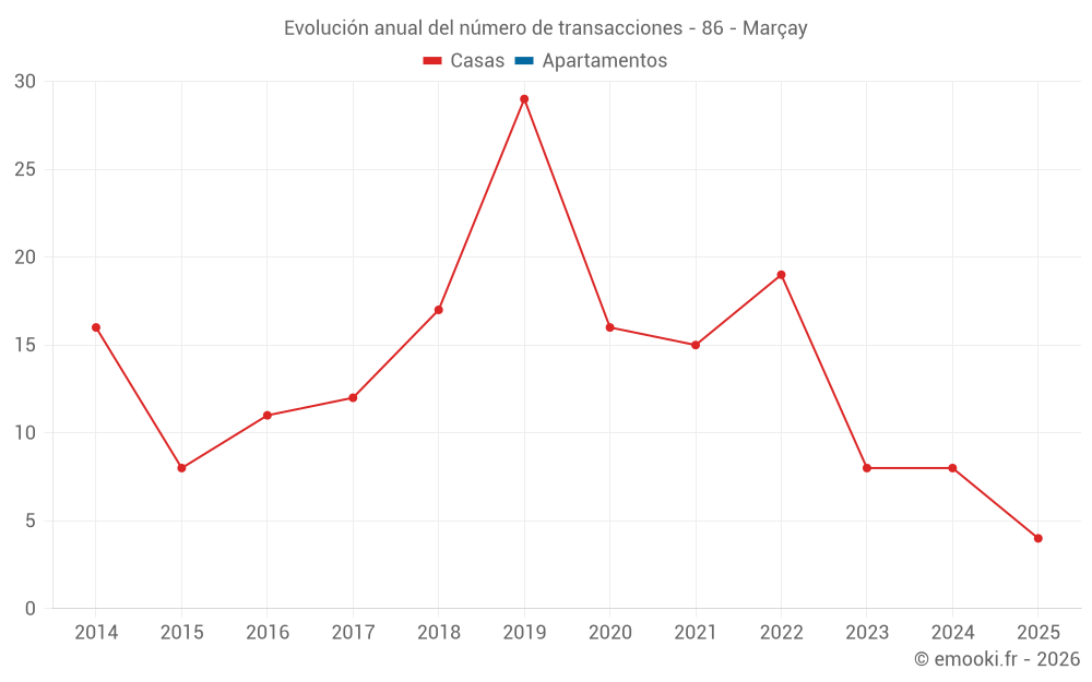 El precio mediano en las 16 transacciones de casas de los últimos 24 meses en la comuna de Marçay fue de 1 580 € por metro cuadrado para un valor patrimonial medio de 164 218 €. Durante este período el 60% de las transacciones estuvieron entre 1 000 y 1 960 € por metro cuadrado (del 2º al 8º decil).