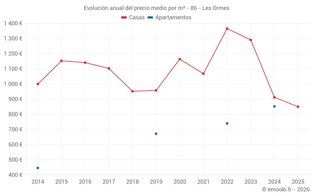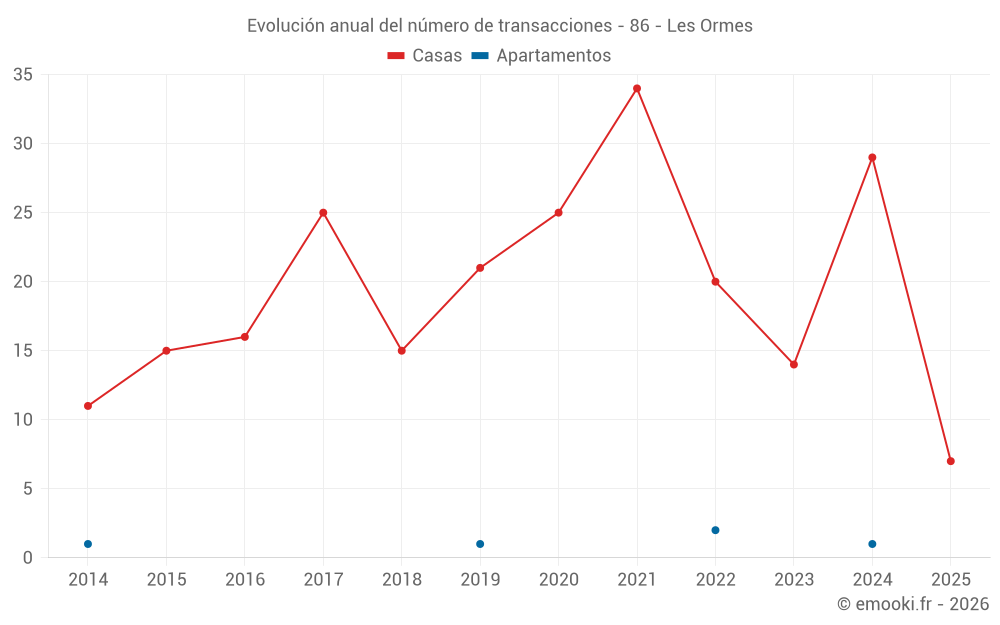 El precio mediano en las 20 transacciones de casas de los últimos 12 meses en la comuna de Les Ormes fue de 914 € por metro cuadrado para un valor patrimonial medio de 91 300 €. Durante este período el 60% de las transacciones estuvieron entre 771 y 1 350 € por metro cuadrado (del 2º al 8º decil).
