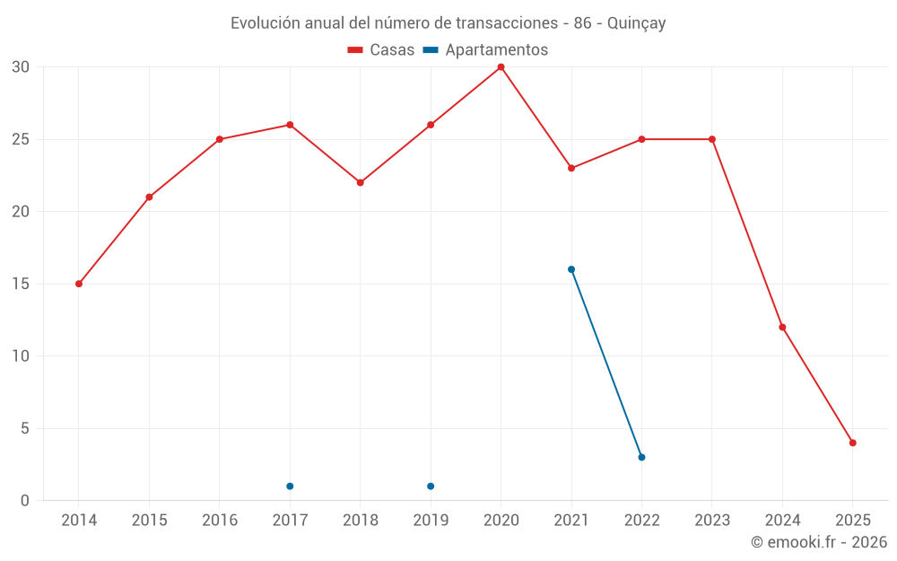 El precio mediano en las 27 transacciones de casas de los últimos 24 meses en la comuna de Quinçay fue de 2 079 € por metro cuadrado para un valor patrimonial medio de 231 000 €. Durante este período el 60% de las transacciones estuvieron entre 1 586 y 2 535 € por metro cuadrado (del 2º al 8º decil).