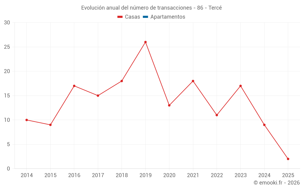 El precio mediano en las 23 transacciones de casas de los últimos 24 meses en la comuna de Tercé fue de 1 852 € por metro cuadrado para un valor patrimonial medio de 161 400 €. Durante este período el 60% de las transacciones estuvieron entre 1 044 y 2 092 € por metro cuadrado (del 2º al 8º decil).