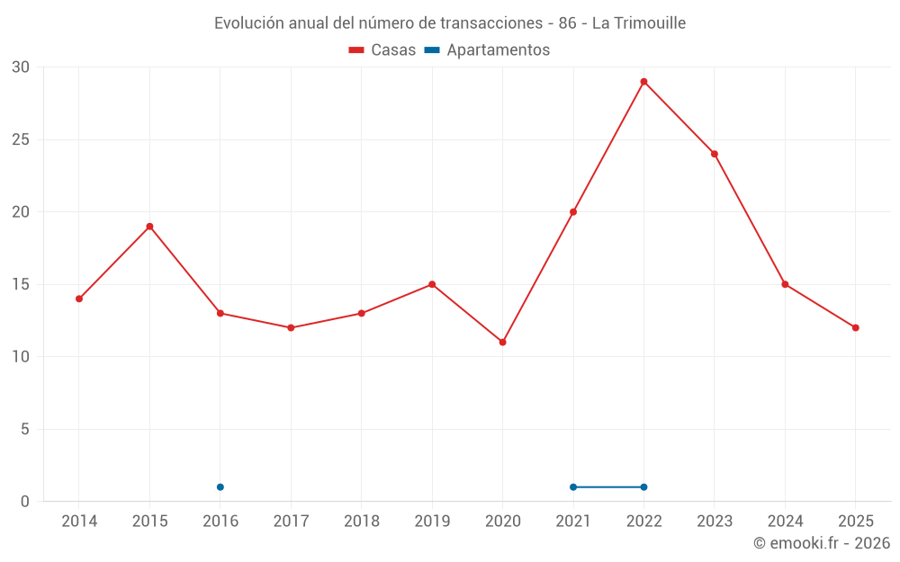 El precio mediano en las 18 transacciones de casas de los últimos 12 meses en la comuna de La Trimouille fue de 619 € por metro cuadrado para un valor patrimonial medio de 60 750 €. Durante este período el 60% de las transacciones estuvieron entre 243 y 1 087 € por metro cuadrado (del 2º al 8º decil).