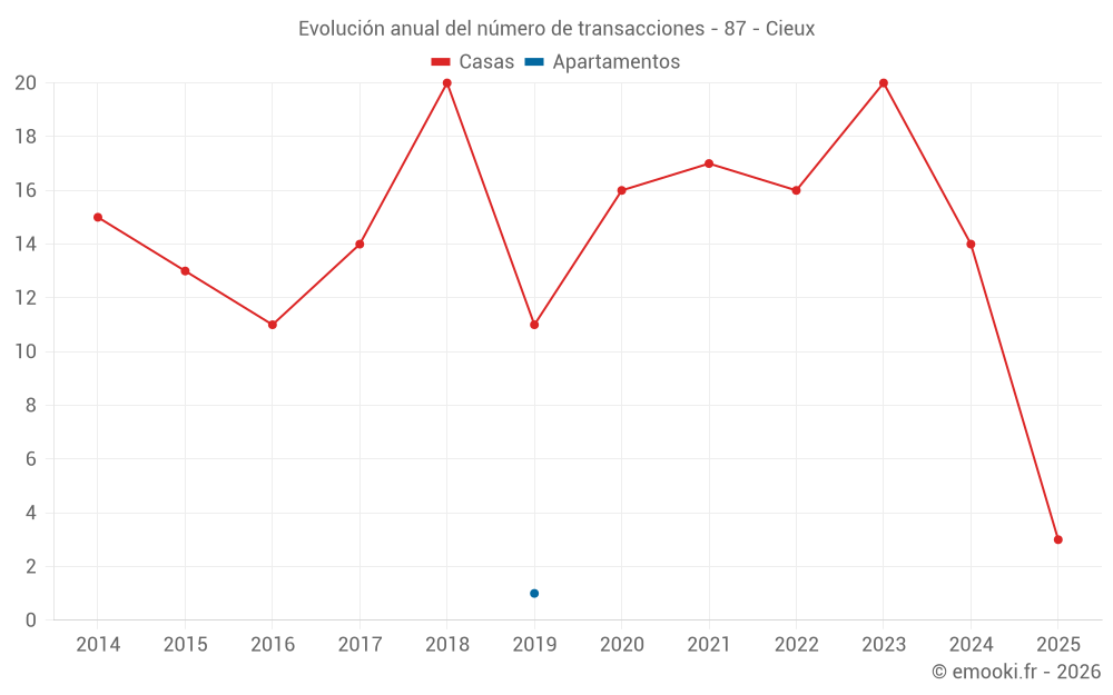 El precio mediano en las 23 transacciones de casas de los últimos 24 meses en la comuna de Cieux fue de 1 250 € por metro cuadrado para un valor patrimonial medio de 91 324 €. Durante este período el 60% de las transacciones estuvieron entre 603 y 1 773 € por metro cuadrado (del 2º al 8º decil).