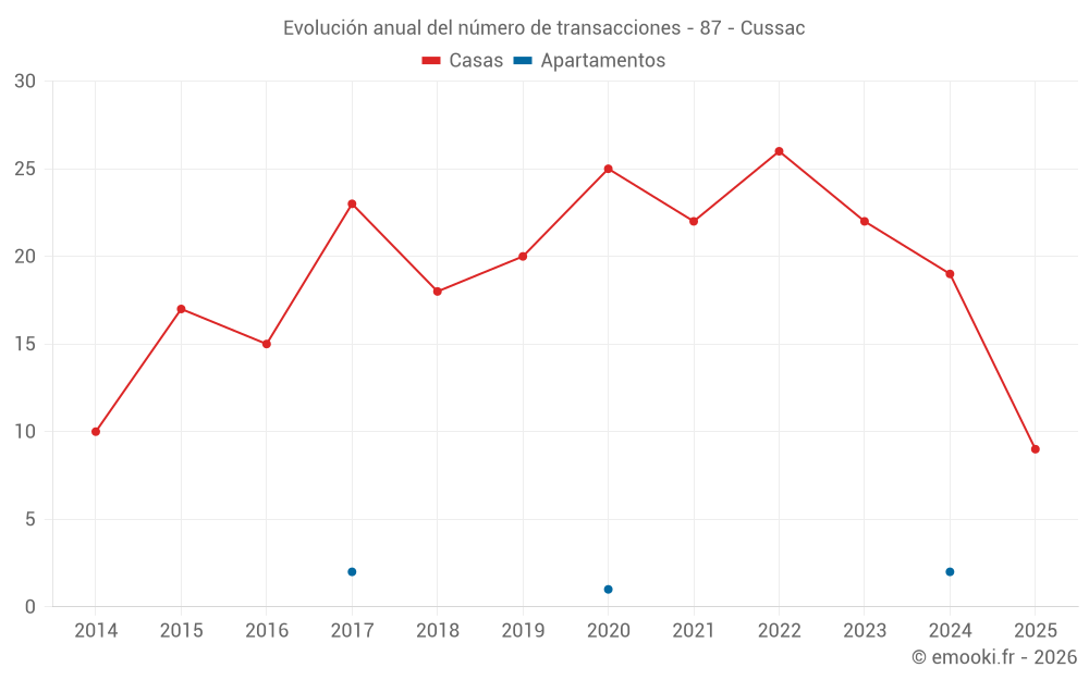 El precio mediano en las 16 transacciones de casas de los últimos 12 meses en la comuna de Cussac fue de 1 068 € por metro cuadrado para un valor patrimonial medio de 75 975 €. Durante este período el 60% de las transacciones estuvieron entre 687 y 1 918 € por metro cuadrado (del 2º al 8º decil).