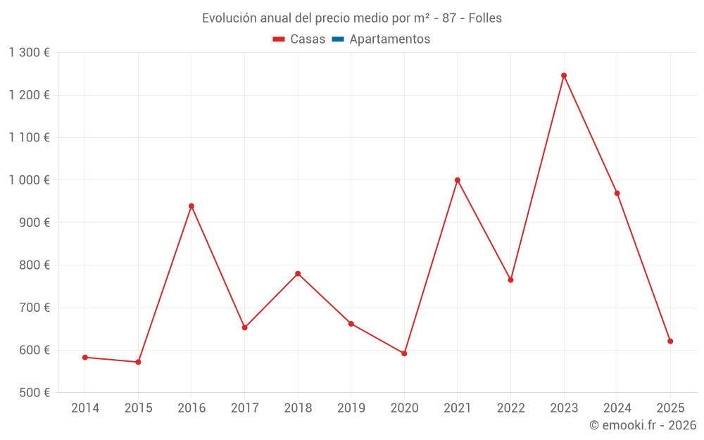 El precio mediano en las 15 transacciones de casas de los últimos 24 meses en la comuna de Folles fue de 969 € por metro cuadrado para un valor patrimonial medio de 79 750 €. Durante este período el 60% de las transacciones estuvieron entre 572 y 1 370 € por metro cuadrado (del 2º al 8º decil).