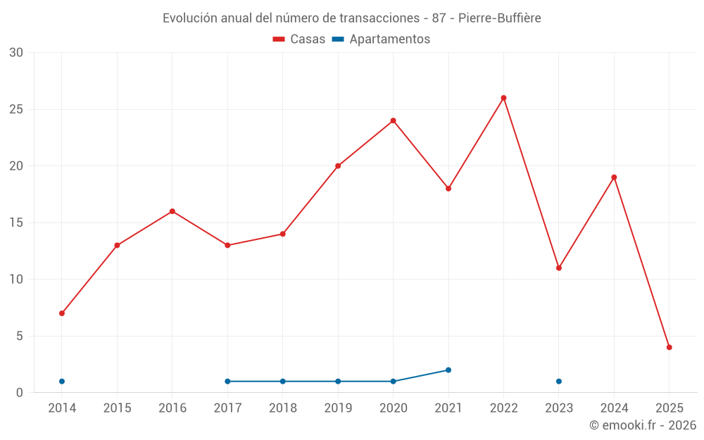 El precio mediano en las 28 transacciones de casas de los últimos 24 meses en la comuna de Pierre-Buffière fue de 1 271 € por metro cuadrado para un valor patrimonial medio de 109 950 €. Durante este período el 60% de las transacciones estuvieron entre 931 y 1 673 € por metro cuadrado (del 2º al 8º decil).