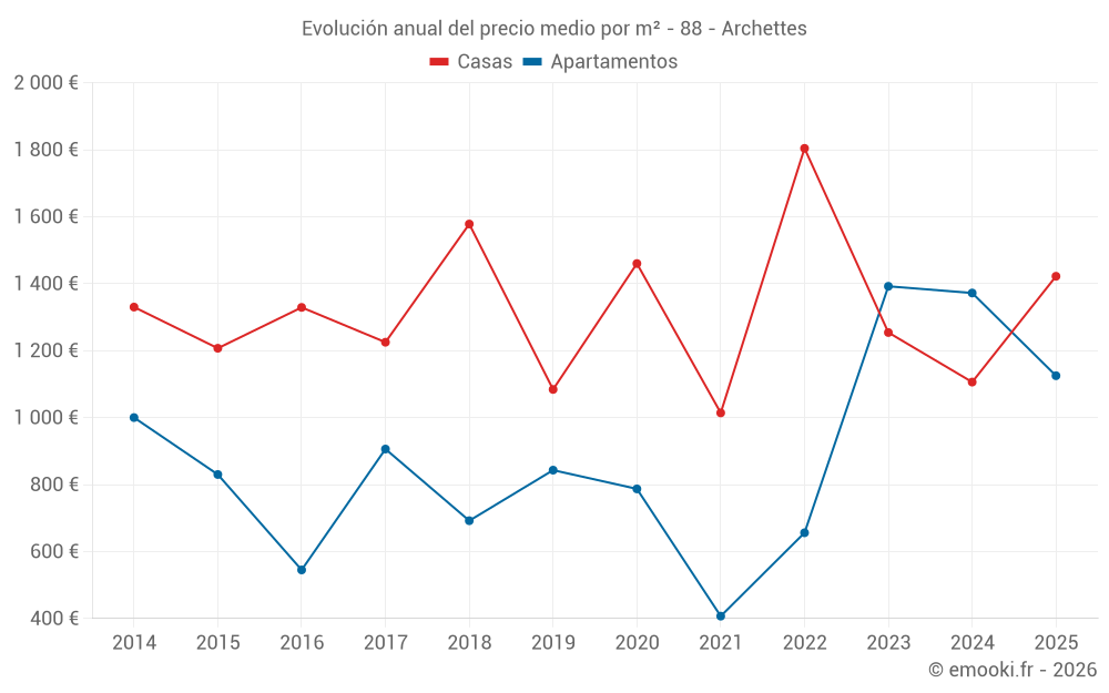 El precio mediano en las 27 transacciones de casas de los últimos 24 meses en la comuna de Archettes fue de 1 254 € por metro cuadrado para un valor patrimonial medio de 157 000 €. Durante este período el 60% de las transacciones estuvieron entre 882 y 2 073 € por metro cuadrado (del 2º al 8º decil).