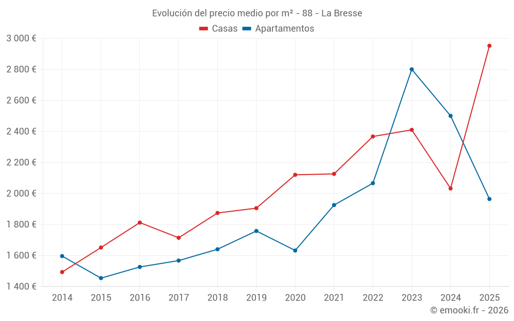 El precio mediano en las 24 transacciones de apartamentos de los últimos 6 meses en la comuna de La Bresse fue de 1 964 € por metro cuadrado para un valor patrimonial medio de 102 500 €. Durante este período el 60% de las transacciones estuvieron entre 1 470 y 3 068 € por metro cuadrado (del 2º al 8º decil).