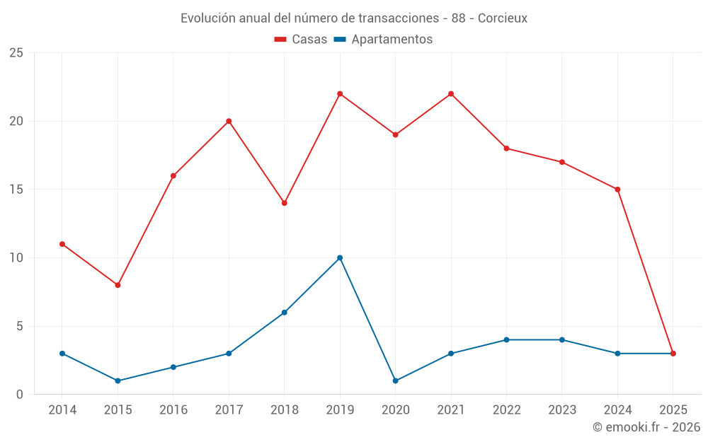 El precio mediano en las 29 transacciones de casas de los últimos 24 meses en la comuna de Corcieux fue de 1 957 € por metro cuadrado para un valor patrimonial medio de 155 000 €. Durante este período el 60% de las transacciones estuvieron entre 928 y 2 895 € por metro cuadrado (del 2º al 8º decil).