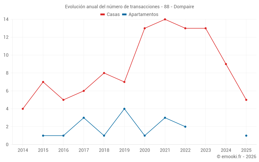 El precio mediano en las 22 transacciones de casas de los últimos 24 meses en la comuna de Dompaire fue de 1 378 € por metro cuadrado para un valor patrimonial medio de 145 200 €. Durante este período el 60% de las transacciones estuvieron entre 986 y 1 880 € por metro cuadrado (del 2º al 8º decil).