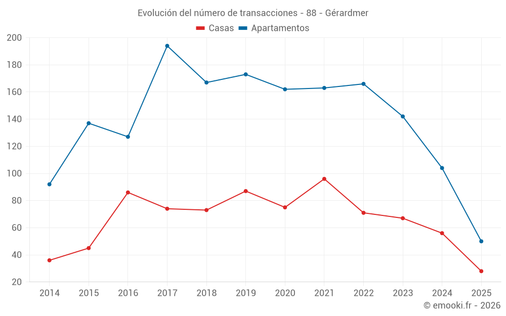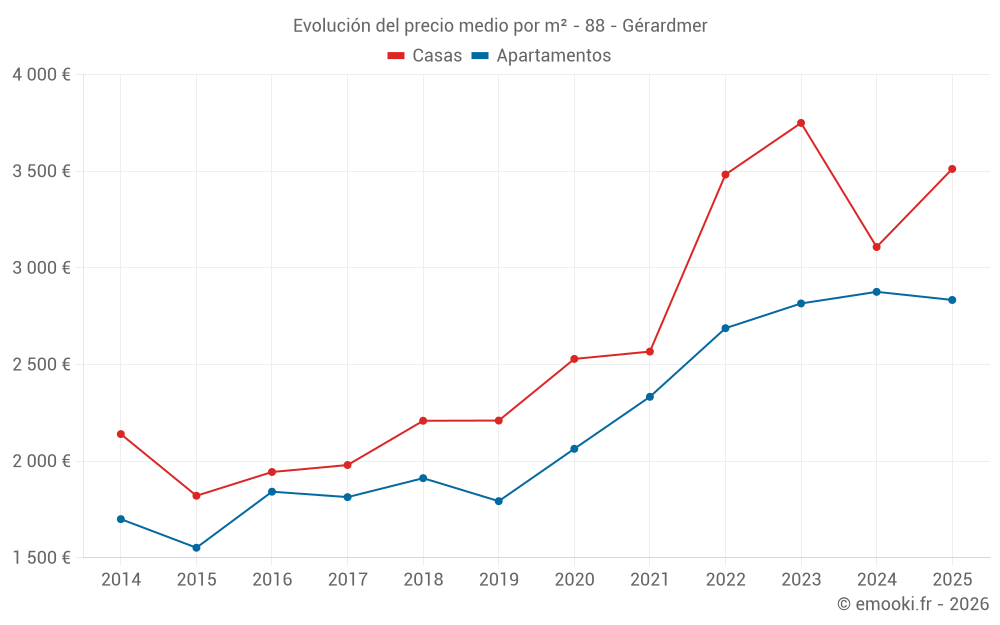 El precio mediano en las 50 transacciones de apartamentos de los últimos 6 meses en la comuna de Gérardmer fue de 2 834 € por metro cuadrado para un valor patrimonial medio de 132 050 €. Durante este período el 60% de las transacciones estuvieron entre 1 882 y 3 762 € por metro cuadrado (del 2º al 8º decil).