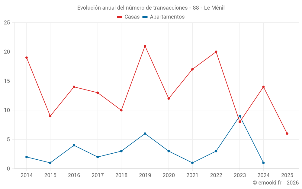 El precio mediano en las 24 transacciones de casas de los últimos 24 meses en la comuna de Le Ménil fue de 1 754 € por metro cuadrado para un valor patrimonial medio de 159 750 €. Durante este período el 60% de las transacciones estuvieron entre 1 332 y 2 478 € por metro cuadrado (del 2º al 8º decil).